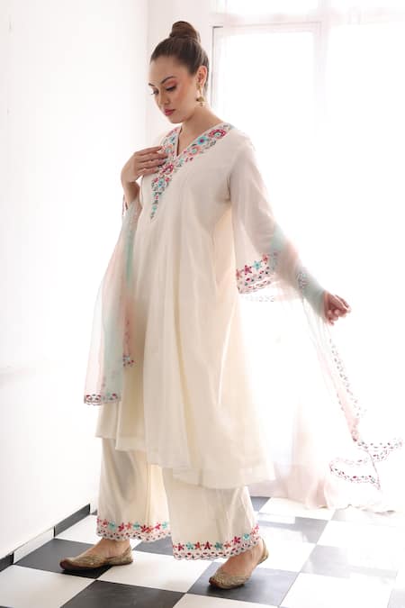 Ivory A-line kurta featuring a multicolor thread embroidered neckline with floral motifs. Paired with an embroidered hem pant and a matching dupatta.
