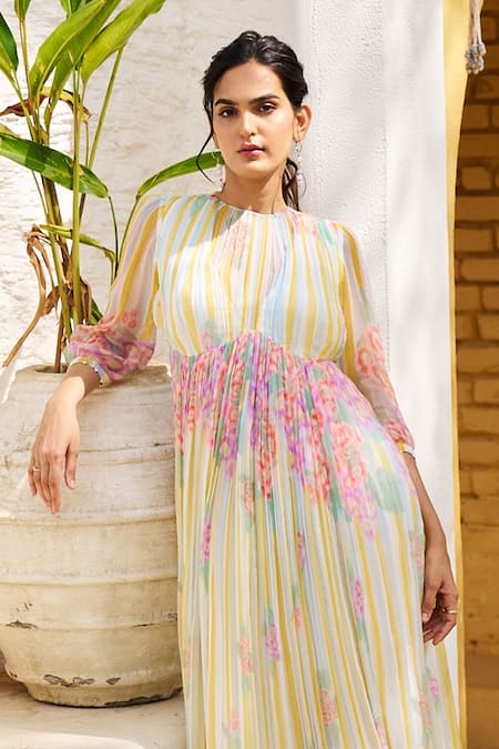Yellow Chiffon High Neck Afina Blossomy Striped Dress