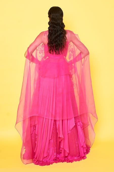 Pink lehenga featuring cascading ruffle upper layer and pleated inner layer. Paired with a noodle strap peplum blouse adorned with petunia garden embroidery and a longline asymmetric organza cape with floral embroidery.