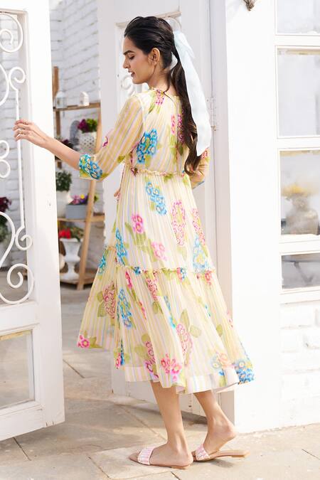 Yellow tiered midi dress featuring a floral and stripe pattern