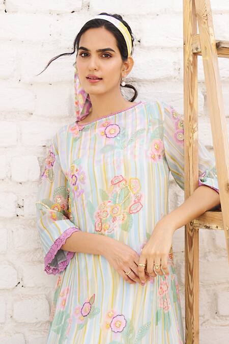 Blue Organza, Crepe Embroidery, Sequins Round Saavi Floral Pattern Midi Dress