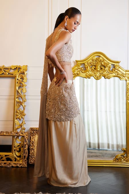 Beige Satin, Net Beads, Floral Embroidered Pre-draped Slit Saree With Blouse
