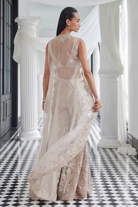 Beige jacket featuring sequin, zari thread, and cutdana embroidered scallop border. Paired with a sleeveless embroidered padded blouse and flared pant.