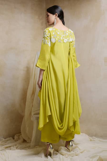 Lime green draped kurta with embroidery at the neckline and asymmetric hem. Comes with palazzo.