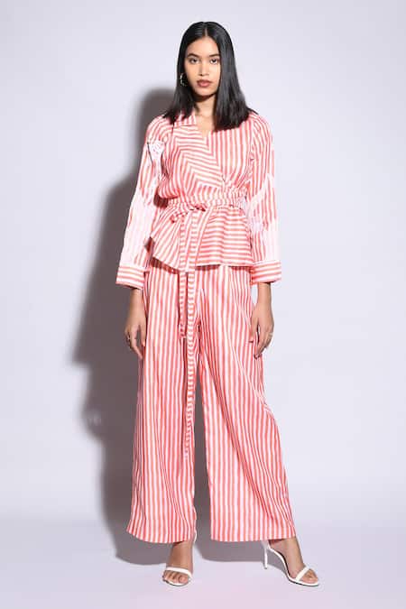 Orange satin silk striped silk top embellished with applique and bead work. Comes with straight fit pant & belt.
