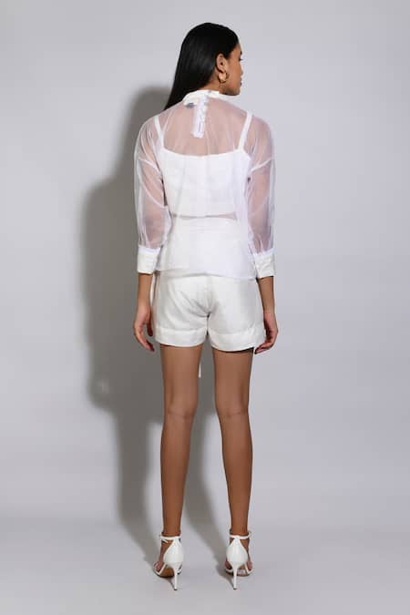 White Silk, Organza Floral Bustier Scoop, Top Shirt Collar Pattern Shorts Set