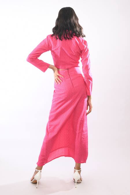 Pink Cotton Zig Zag Print Wide Shirt Collar Top And Skirt Set