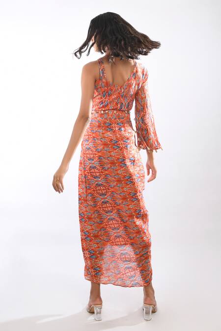 Orange twill crush abstract printed asymmetric top with shell embellishments.