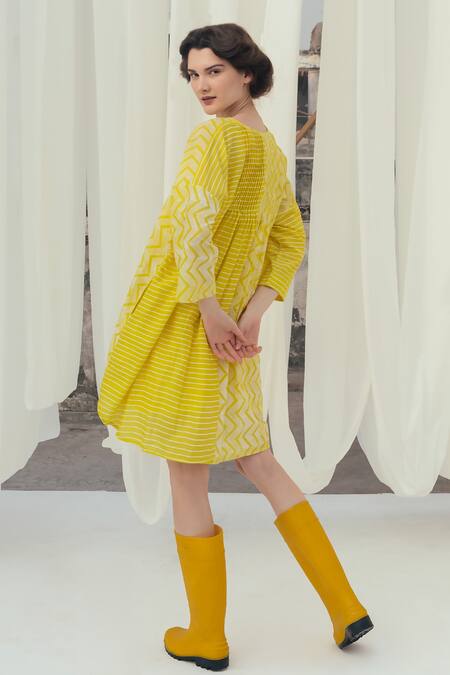 Yellow dress featuring stripe and chevron hand block prints with kimono sleeves