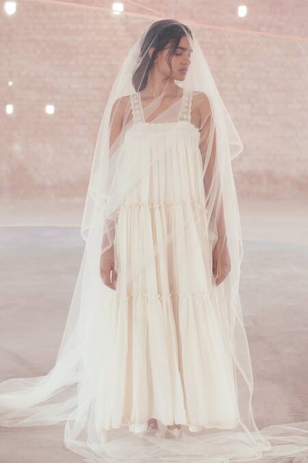 Off-white A-line tiered dress featuring floral and checkered hand block print