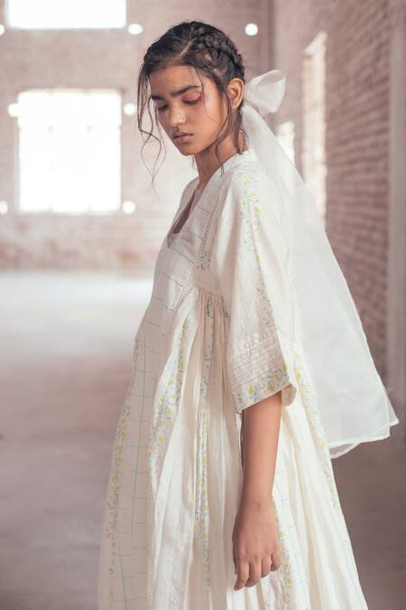 Off-white dress featuring a V neck, three-quarter sleeves, and hand block print with checkered and floral patterns. Paired with a slip and includes side pockets and a lace embroidered panel.