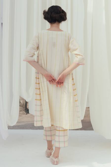 Beige handwoven mul cotton kurta featuring contrast stripe pattern and tonal floral thread hand embroidery. Paired with an inner slip and designed with checkered pattern side pleated panels.