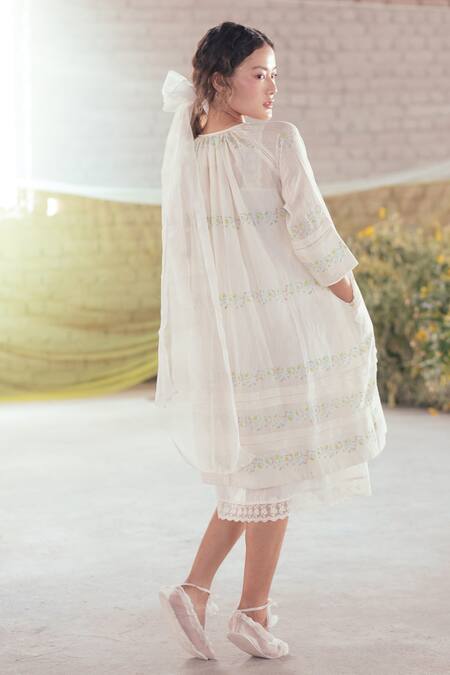 Off White Handloom Cotton Embroidery Round Floral Hand Block Printed Midi Dress