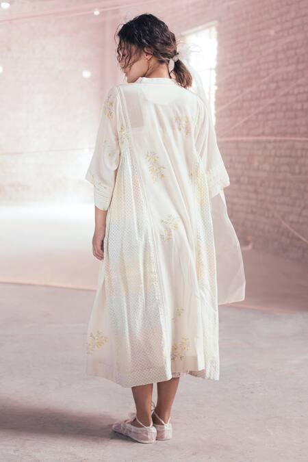 Off White Handloom Cotton, Silk Floral Polka Dot Hand Block Print A-line Dress