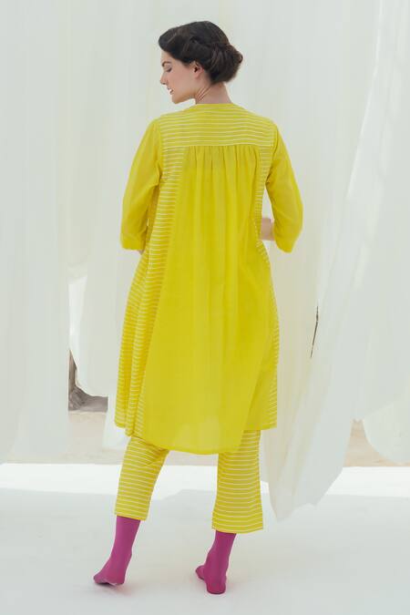 Yellow handwoven cotton silk A-line kurta featuring stripe screen print panels and a printed back yoke. Comes with a sleeveless inner slip.