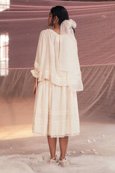 Off white top featuring a checkered fabric base with lace detail and a pleated hemline. Comes with an inner slip for added comfort.