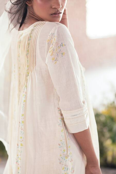 Off-white dress featuring pintuck detailing and periwinkle hand block print in a linear pattern. Paired with a slip, it has a lace embroidered hem and three-quarter sleeves.