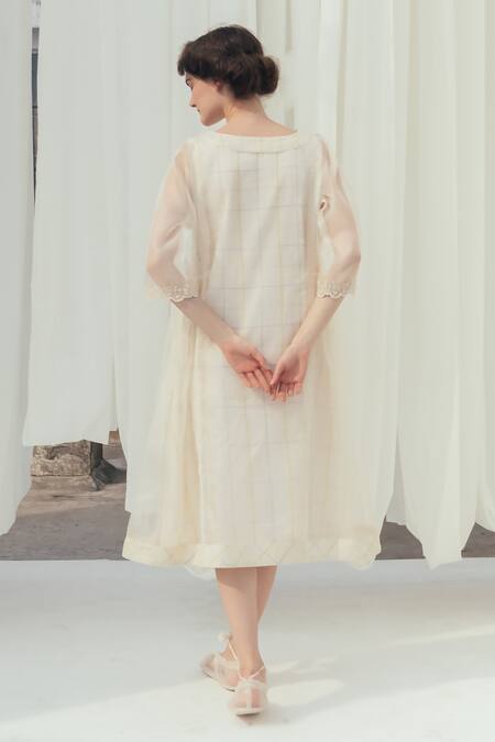 Beige silk organza dress featuring side pleated panels and crochet lace work details. Paired with a hand-spun, handwoven cotton inner slip.