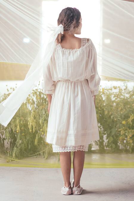 Off-white dress featuring a checkered hand block print and a keyhole neckline. Includes a matching slip and features a front tie-up knot and lace embroidered hem.