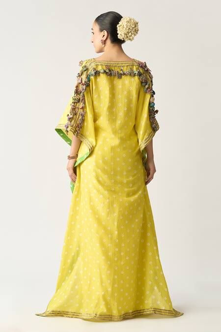 Yellow Silk Chanderi Bandhani Plunge V Neck Babita Kaftan And Pant Set