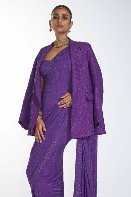 Purple Jersey Lining Lycra Crystal Blazer Collar Pre-draped Saree With