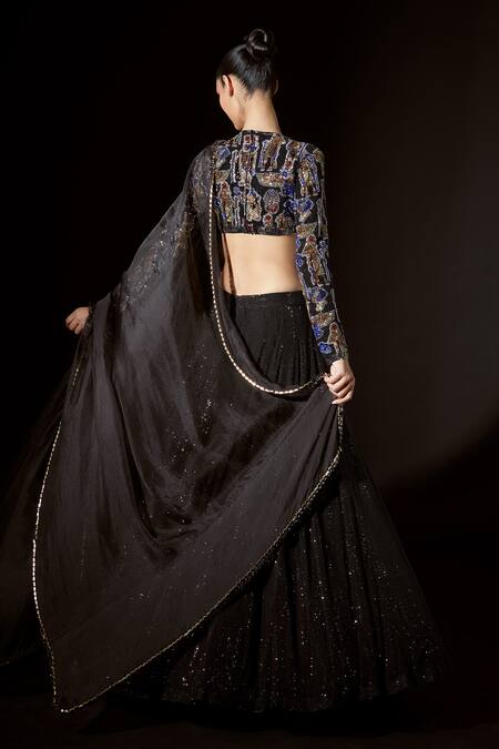 Black Net, Silk Organza Crystals, Figurine Flow Embellished Blouse Lehenga Set