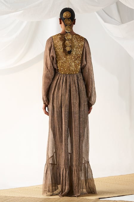 Black tissue long padded dress featuring gathering at the bottom and ghunghroo work on the bodice. Paired with elasticated color block printed pant.