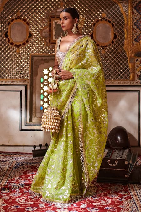 Green Silk Organza, Lampi Gota Scoop Neck Embroidered Saree With Blouse