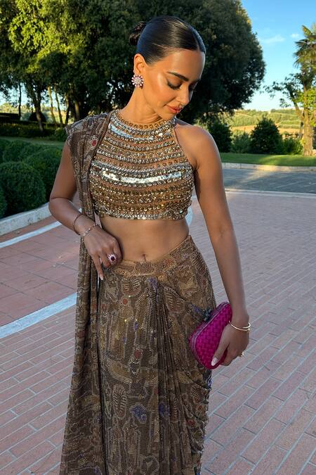Gold pre-stitched saree featuring heirographic motifs embellished with multi-coloured stones. Accompanied by a crystal embellished blouse.