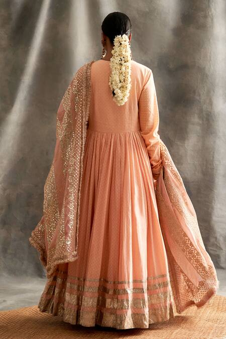 Peach angrakha with dotted motifs, gathered flare & striped hem. Comes with lycra net churidar & silk organza dupatta enhanced with hand embroidered gota patti & kiran work.