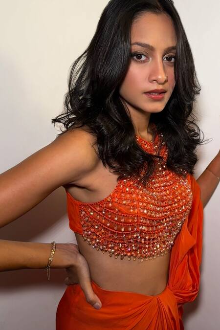 Orange draped saree in chiffon with a net base. Paired with a crystal embellished blouse featuring a high neck and sleeveless design.
