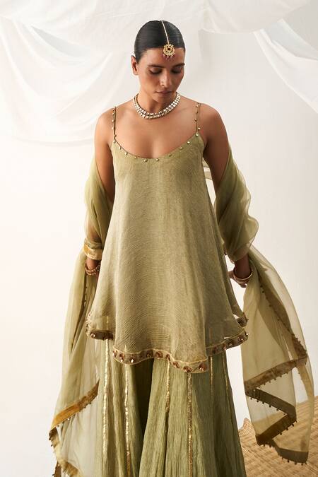 Green Organza, , Satin Embroidery, Placement Tunic And Sharara Set