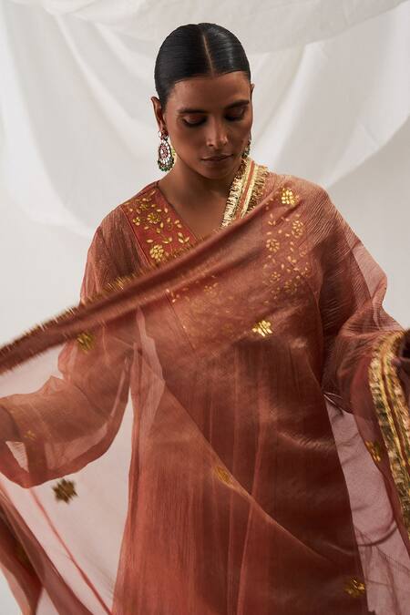 Peach kurta featuring full sleeves and a V-neckline with floral embroidery. Paired with a lehenga skirt and a dupatta adorned with gota fringe border and embroidered buttis.