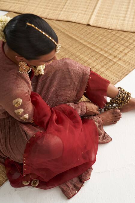 Maroon full sleeve pleated flare anarkali featuring golden disc embroidery on the sleeves. Paired with a sheer panel detailed pant and a golden butti embroidered dupatta.
