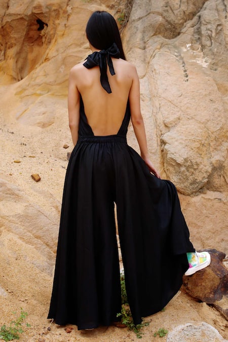 Black Silk Halter Neck Plunge Jumpsuit