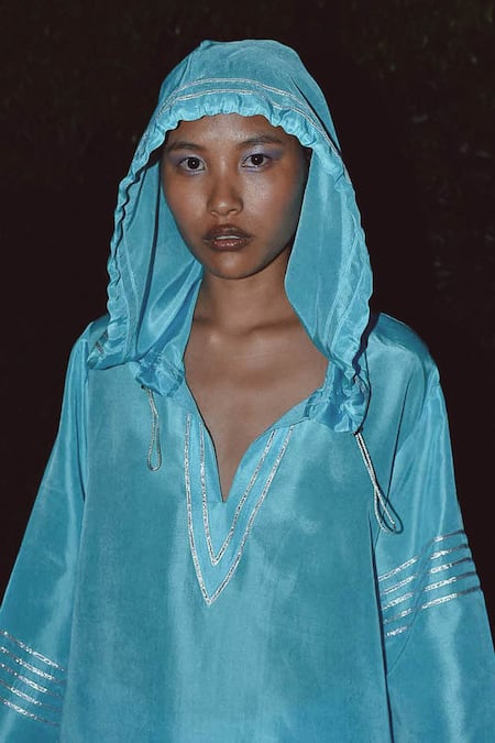 Sky blue silk high-low kurta featuring silver gota work embellishments and functional pockets. Paired with a matching salwar for a complete look.