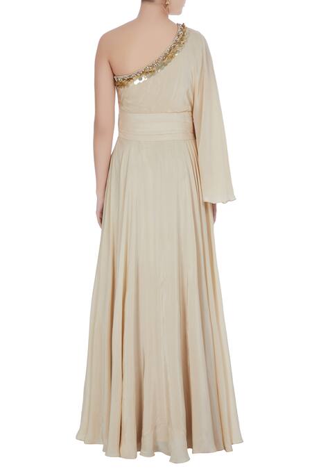 Luxe, posh and impeccably designed to perfection, this ivory cotton flared gown features an off-shoulder style, enhanced with gold sequin embroidery at the border. Team up with gold heels for a great look.