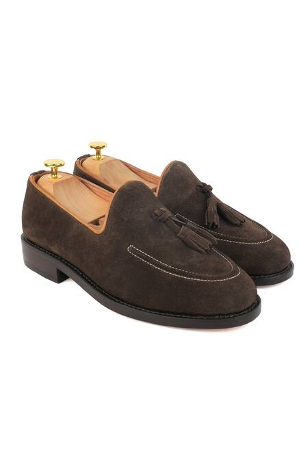 Brown suede shoes featuring tassel embellishment and stitch line detailing