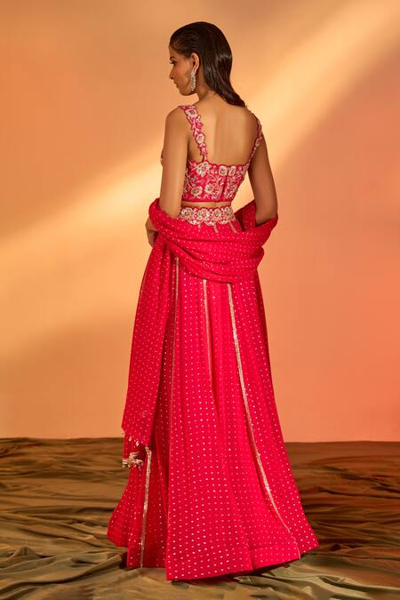 Hot pink lehenga featuring floral hand embroidery with an embroidered waistband. Paired with a blouse and a dupatta, this set is crafted from crepe and georgette with a shantoon lining.