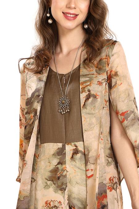 Beige Silk Organza Watercolour Print Round Jacket Style Jumpsuit