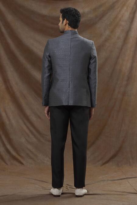 Grey bandhgala featuring a jacquard base with full sleeves and front button down placket. Paired with matching pants made from terry rayon.