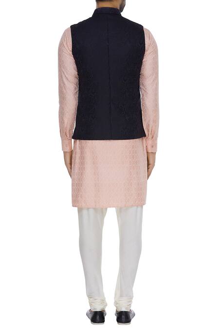 A combination of indian silhouette with western aesthetics, this bundi jacket accentuates snake-skin texture crafted in jacquard weave. It is highlighted with silver ball buttons on the front placket.