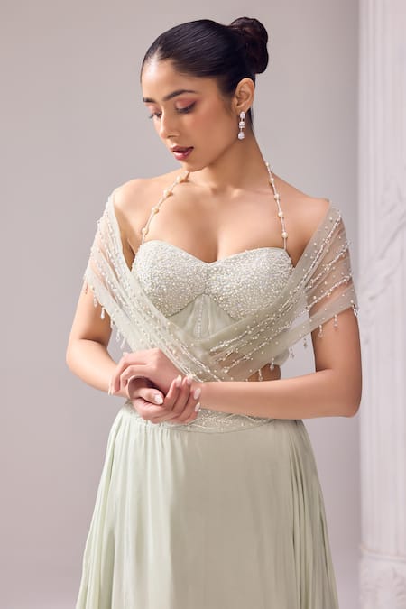 Green Oxford, Net Pearls, Cut Work Austin Layered Embroidered Draped Lehenga Set