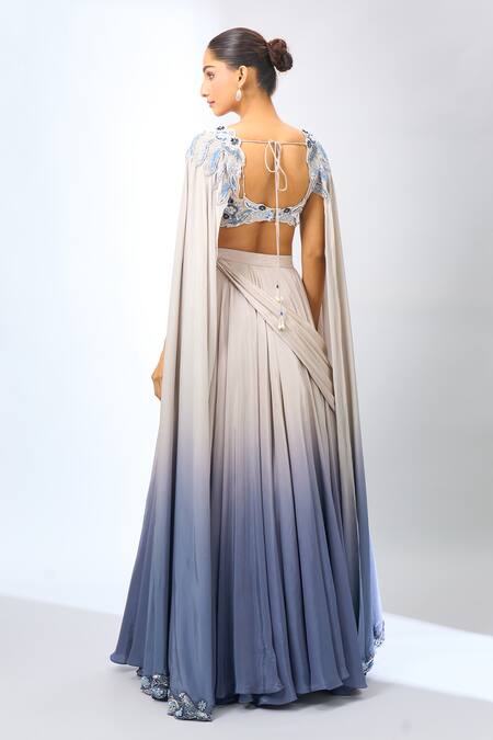 Beige and blue ombre draped lehenga featuring intricate embellishments. Paired with a matching embellished blouse with a cape design.