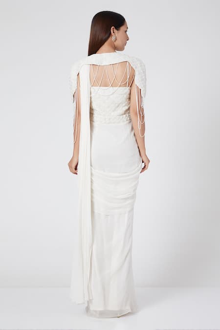 White pre-draped with placement floral motif bead work in checkered pattern. Paired with layered tassel capelet.