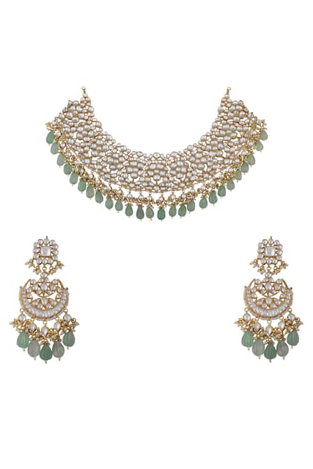 22kt gold plated jadtar necklace featuring jade green drops and embellished chandbalis. Includes a necklace and a pair of earrings adorned with real jadtar stones, semi-precious stones, pearls, and glass beads.