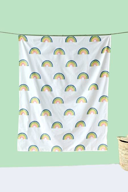 White baby cot set with rainbow prints and consists of baby razai, baby cot sheet, pillow cover and 2 baby bolster cover.