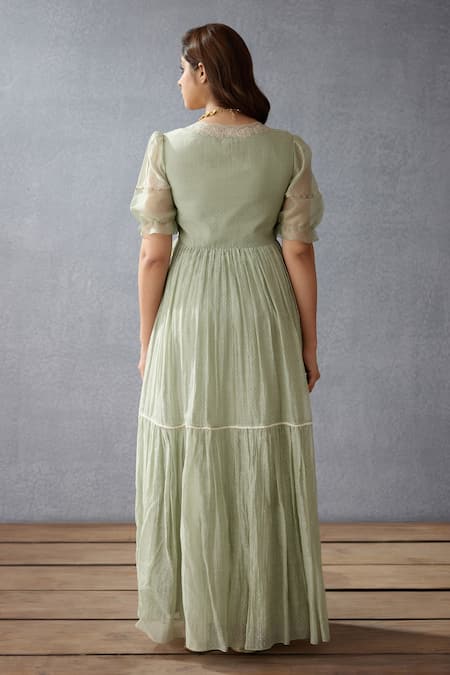 Sage green gathered gown with polka dot print, puff sleeves & embroidered neckline.