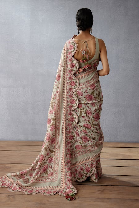 Sage green handwoven chanderi saree with chintz print, scallop border & tassel pallu hem.