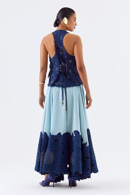 An indigo racer back jacket crafted from silk chanderi, featuring blossom cutwork with a lace-up back closure and white bead embellishments. Paired with an ice blue full-length skirt with a wide indigo cutwork border adorned with white bead embellishments.